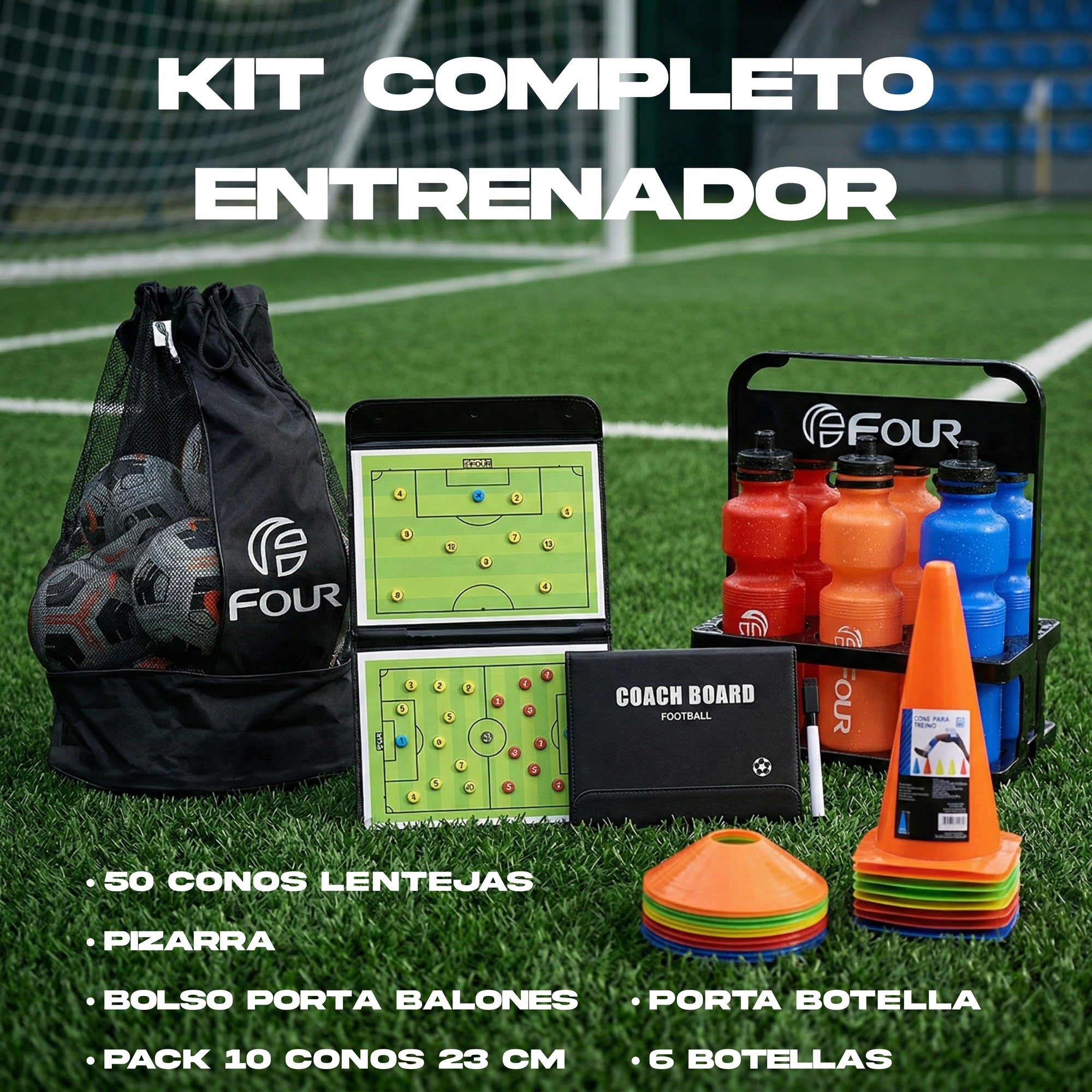 Pack Entrenador Fútbol Completo – Pizarra + Botellas + Conos + Bolso | Four